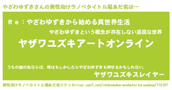 | 胡散臭い通販商品みたいなあだ名 | 『億万長者になれるブレスレット…その名も「やざわゆずき」』 |