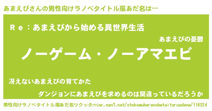| 伝説のあだ名 | 『救世主となる錬金術士あまえび』 |