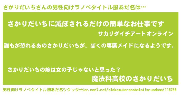 | 胡散臭い通販商品みたいなあだ名 | 『来世でも幸せになれる水素水…その名も「さかりだいち」』 |