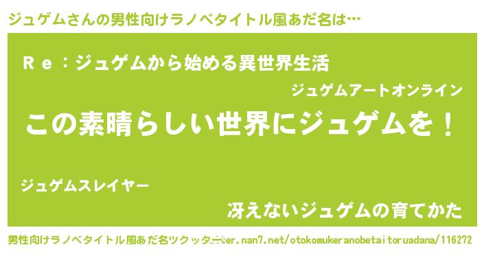 | 女子向けラノベタイトル風あだ名 | 『乙女ゲームの破滅フラグしかない悪役ジュゲムに転生してしまった…』 |