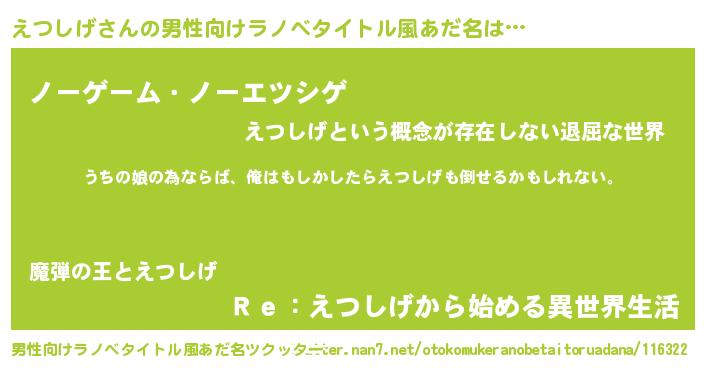 | 胡散臭い通販商品みたいなあだ名 | 『運命の人と巡り会える高級そうな絵画…その名も「えつしげ」』 |