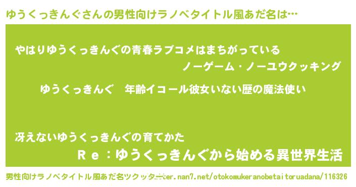 | 女子向けラノベタイトル風あだ名 | 『ゆうくっきんぐの玉の輿計画!』 |