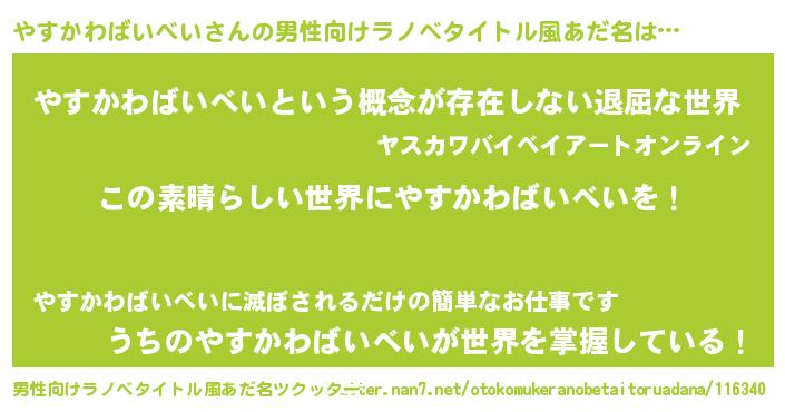 | 女子向けラノベタイトル風あだ名 | 『悪役やすかわばいべいに転生したようですが、知った事ではありません』 |