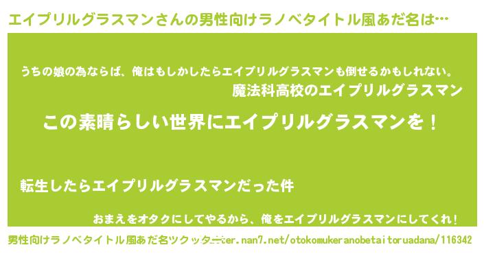 | 女子向けラノベタイトル風あだ名 | 『乙女ゲームの破滅フラグしかない悪役エイプリルグラスマンに転生してしまった…』 |