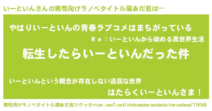 | 女子向けラノベタイトル風あだ名 | 『いーといんの玉の輿計画!』 |