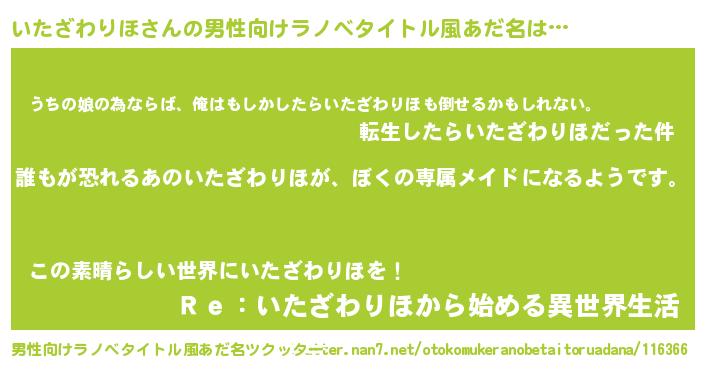 | 女子向けラノベタイトル風あだ名 | 『異世界でカフェいたざわりほを開店しました。』 |