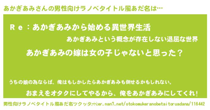 | 女子向けラノベタイトル風あだ名 | 『あかぎあみ様がみてる』 |