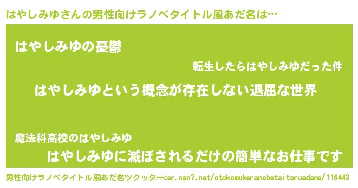 | 女子向けラノベタイトル風あだ名 | 『異世界で失敗しない100のはやしみゆ』 |