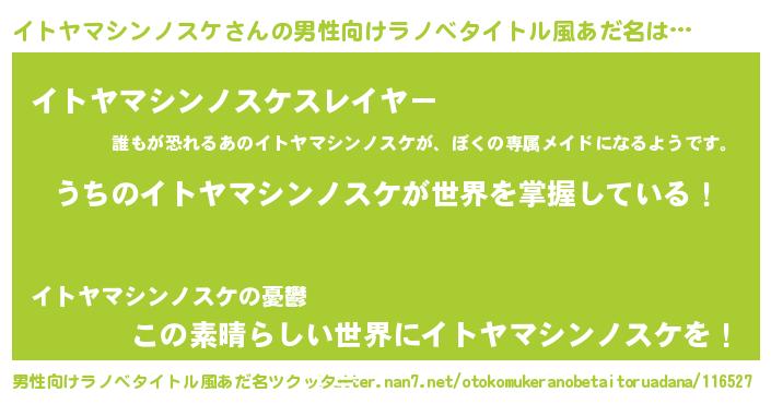 | 胡散臭い通販商品みたいなあだ名 | 『あなたにだけ特別に提供する限定10本のレアな日本酒…その名も「イトヤマシンノスケ」』 |