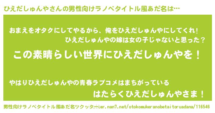 | 女子向けラノベタイトル風あだ名 | 『悪役ひえだしゅんやに転生したようですが、知った事ではありません』 |