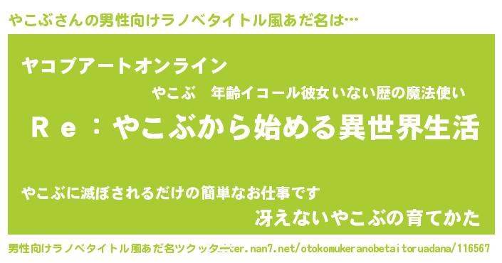 | 女子向けラノベタイトル風あだ名 | 『闇のやこぶ』『男装やこぶの憂鬱な任務』 |