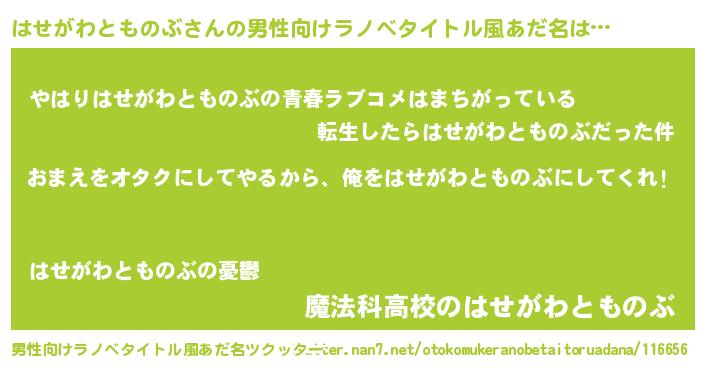 | 女子向けラノベタイトル風あだ名 | 『はせがわとものぶ夫妻のなれそめ』 |