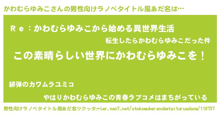 | 女子向けラノベタイトル風あだ名 | 『乙女ゲームの破滅フラグしかない悪役かわむらゆみこに転生してしまった…』 |