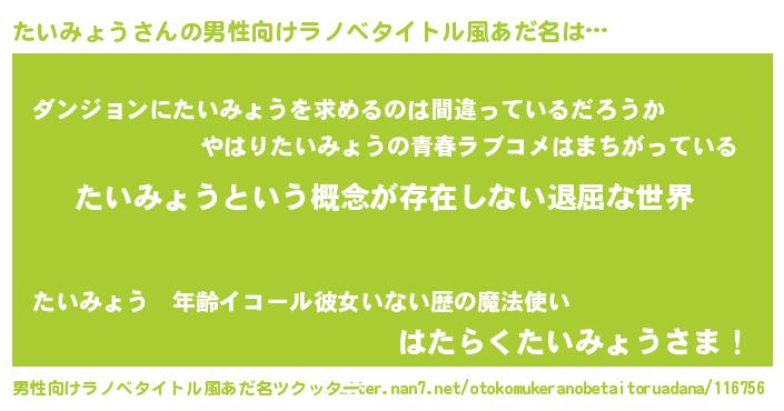 | ヘコむあだ名 | 『たいみょう(小並感)』『たいお』 |