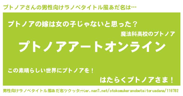 | 女子向けラノベタイトル風あだ名 | 『誰かこのプトノアを説明してください! ~契約から始まるウェディング~』 |
