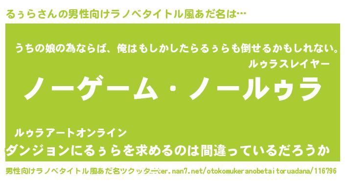 | ヒーロー風カッコイイあだ名 | 『慈愛の使者るぅら』『魔戒騎士ルゥ』 |