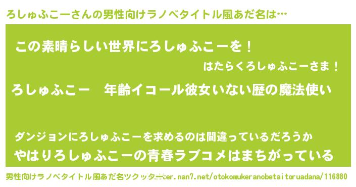 | 女子向けラノベタイトル風あだ名 | 『ろしゅふこーの玉の輿計画!』 |