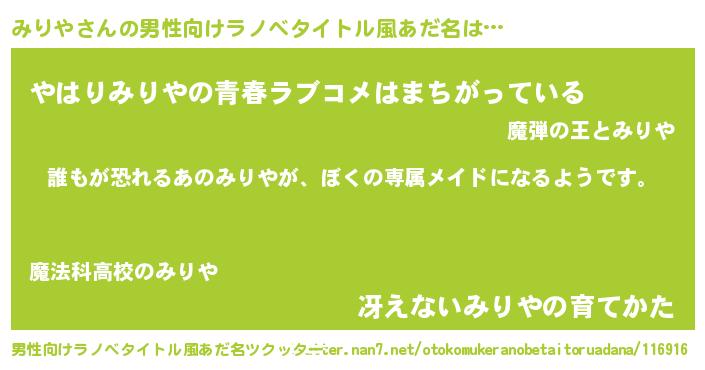 | ヘコむあだ名 | 『みりや(笑)』『なまこ酢』『みりを』 |
