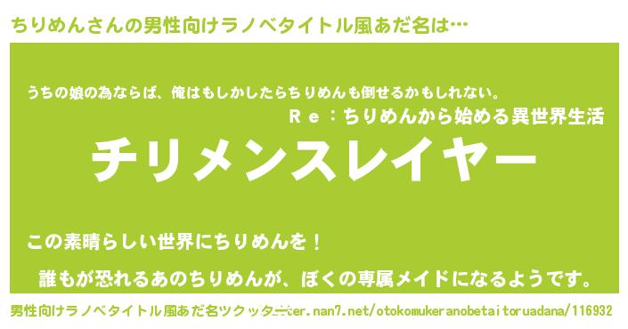 | 女子向けラノベタイトル風あだ名 | 『婚約破棄系悪役ちりめんに転生したので、保身に走りました。』 |
