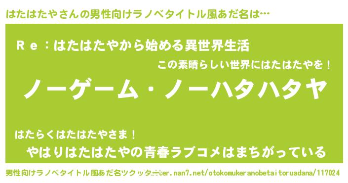 | 女子向けラノベタイトル風あだ名 | 『はたはたや恋絵巻』『闇のはたはたや』 |