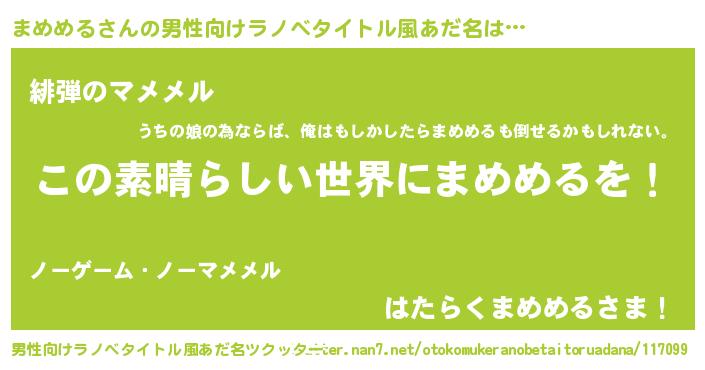 | 胡散臭い通販商品みたいなあだ名 | 『あなたにだけ特別に提供する世界で10本だけ現存している希少なブランデー…その名も「まめめる」』 |