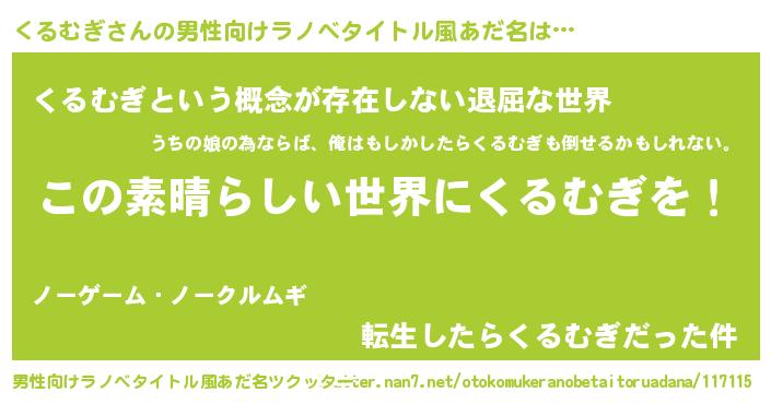 | 女子向けラノベタイトル風あだ名 | 『乙女ゲームの破滅フラグしかない悪役くるむぎに転生してしまった…』 |