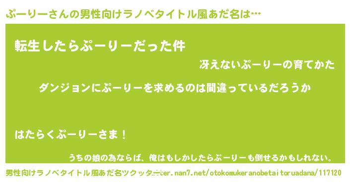 | 女子向けラノベタイトル風あだ名 | 『ぷーりーの卵を拾いまして』 |