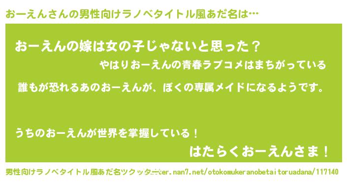 | 女子向けラノベタイトル風あだ名 | 『おーえんの契約王妃』 |