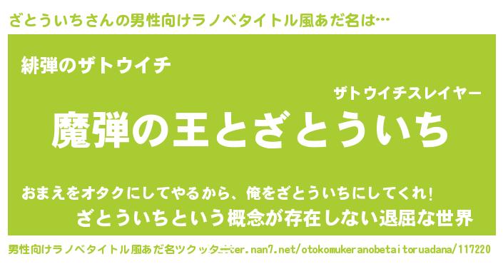 | 女子向けラノベタイトル風あだ名 | 『ざとういちが死なない童話 林檎のざとういちの診療簿』 |