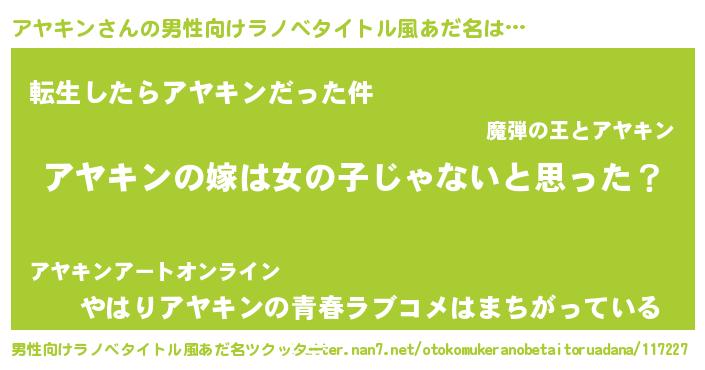 | 女子向けラノベタイトル風あだ名 | 『アヤキン様がみてる』 |