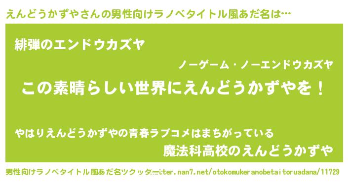 | 女子向けラノベタイトル風あだ名 | 『悪役えんどうかずやに転生したようですが、知った事ではありません』 |