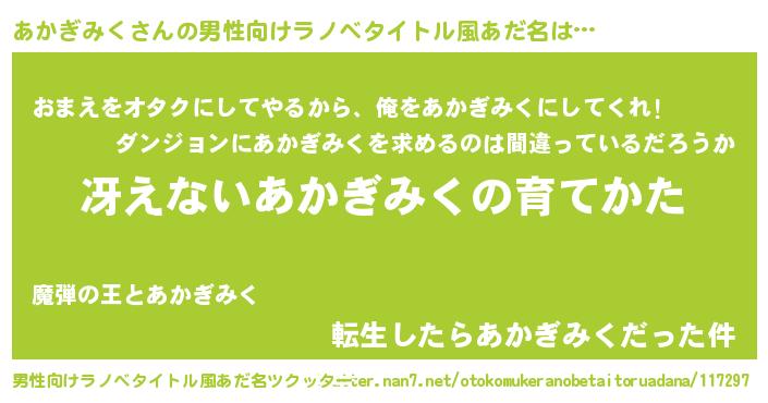 | 女子向けラノベタイトル風あだ名 | 『シンデレラあかぎみく家の靴箱館』 |