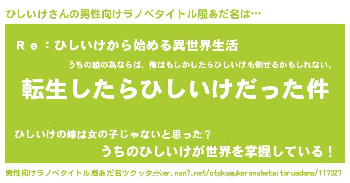 | 女子向けラノベタイトル風あだ名 | 『ひしいけの玉の輿計画!』 |
