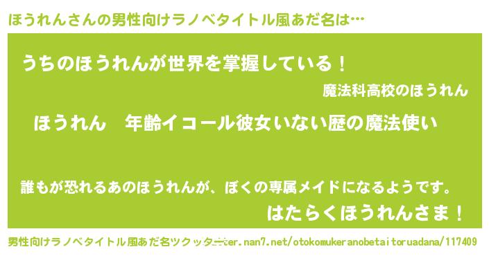 | 女子向けラノベタイトル風あだ名 | 『ほうれんの玉の輿計画!』 |