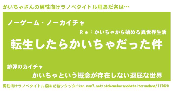 | 女子向けラノベタイトル風あだ名 | 『かいちゃの玉の輿計画!』 |