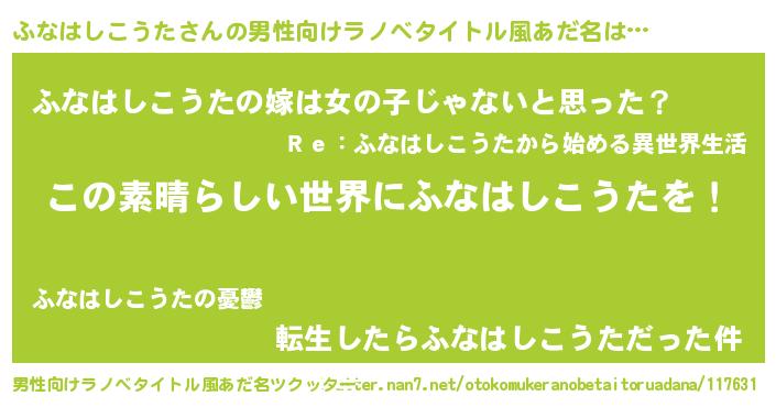 | 女子向けラノベタイトル風あだ名 | 『乙女ゲームの破滅フラグしかない悪役ふなはしこうたに転生してしまった…』 |
