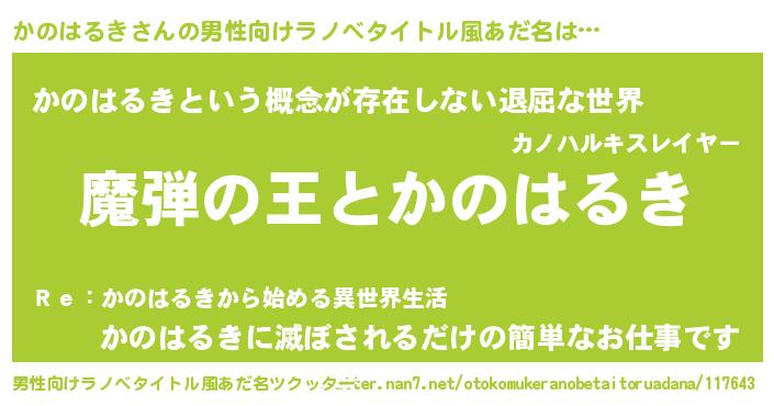 | 女子向けラノベタイトル風あだ名 | 『乙女ゲームの破滅フラグしかない悪役かのはるきに転生してしまった…』 |