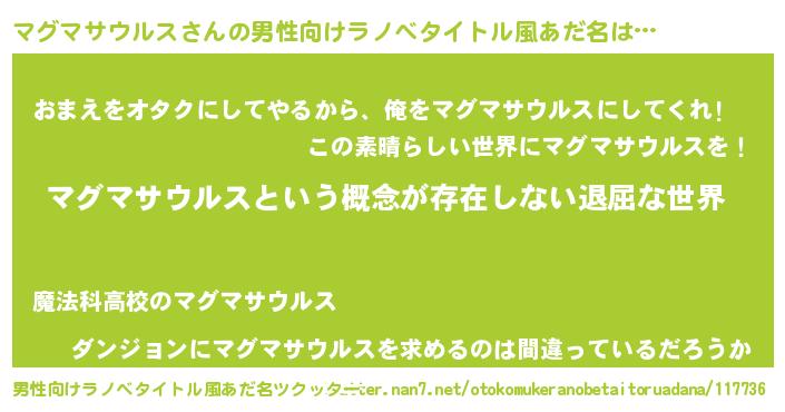 | 胡散臭い通販商品みたいなあだ名 | 『絶対に幸福をもたらす健康食品…その名も「マグマサウルス」』 |