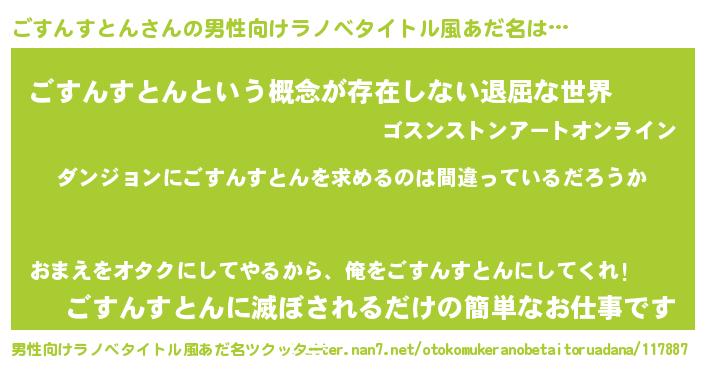 | 女子向けラノベタイトル風あだ名 | 『ごすんすとんは平凡を望む』 |