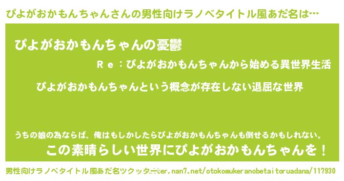 | 女子向けラノベタイトル風あだ名 | 『異世界で失敗しない100のぴよがおかもんちゃん』 |