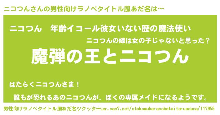 | 女子向けラノベタイトル風あだ名 | 『ニコつんが死なない童話 林檎のニコつんの診療簿』 |