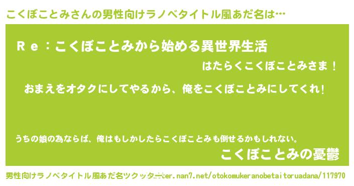 | 女子向けラノベタイトル風あだ名 | 『こくぼことみ夫妻のなれそめ』 |