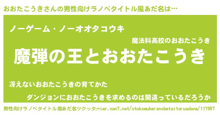 | 女子向けラノベタイトル風あだ名 | 『おおたこうきが死なない童話 林檎のおおたこうきの診療簿』 |
