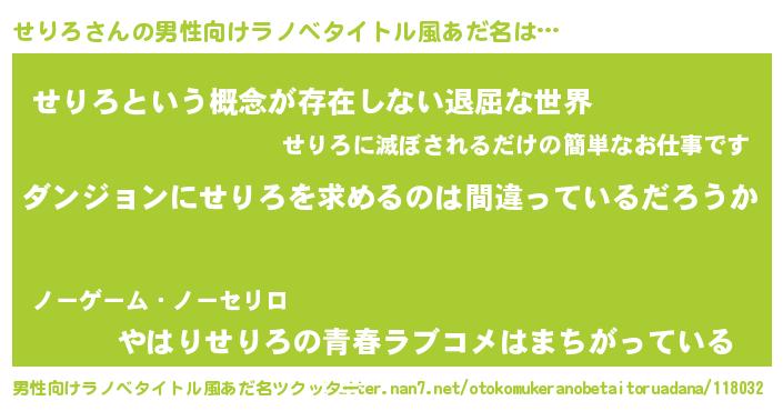 | ヘコむあだ名 | 『せりお』『せりろ(震え声)』 |