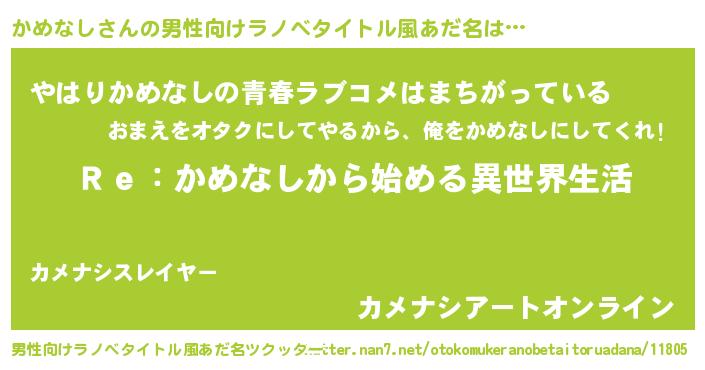 | 女子向けラノベタイトル風あだ名 | 『闇のかめなし』『かめなし伯爵の花嫁』 |
