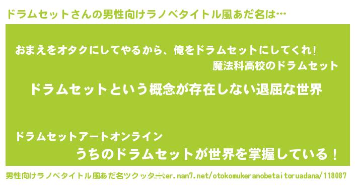 | 胡散臭い通販商品みたいなあだ名 | 『来世でも幸せになれる水素水…その名も「ドラムセット」』 |