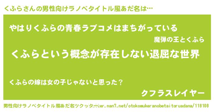 | 女子向けラノベタイトル風あだ名 | 『くふらの契約王妃』『くふら様がみてる』 |
