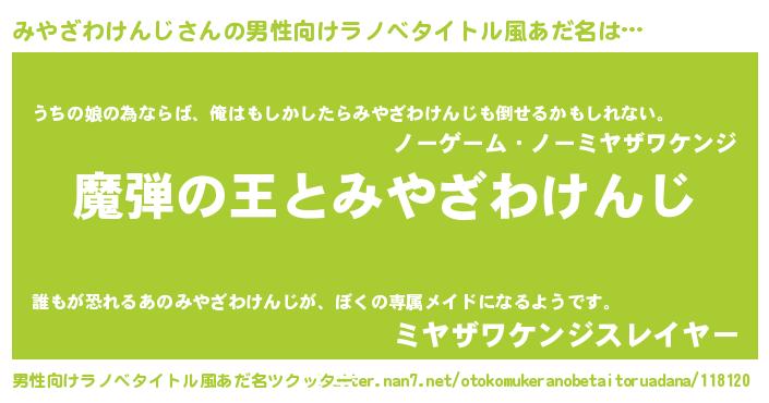 | 女子向けラノベタイトル風あだ名 | 『みやざわけんじが死なない童話 林檎のみやざわけんじの診療簿』 |
