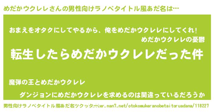 | 女子向けラノベタイトル風あだ名 | 『めだかウクレレの玉の輿計画!』 |