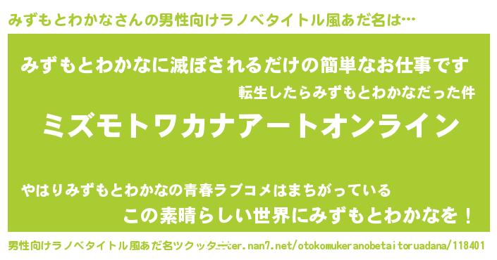 | 女子向けラノベタイトル風あだ名 | 『誰かこのみずもとわかなを説明してください! ~契約から始まるウェディング~』 |
